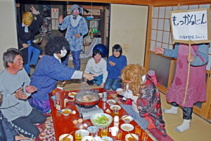 「もっかんじん」と言う。1月14日の夜に成人の男女が数人ずつ、厚化粧の思い思いの姿に変装し、または、面などをかぶり、太鼓や石油缶などを叩きながら訪れて、庭で黙って踊り騒ぐ。座敷にも上がってくる。厄年の男女の厄払いの行事である。餅勧進は餅貰いの意で、負い籠を負った一人が餅を集めていくが、最近は餅よりも焼酎や金を包んで渡す。来訪者は「厄を払う」意の、熨斗紙のかかった手箒を訪れた家に持参する。