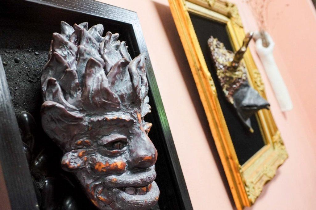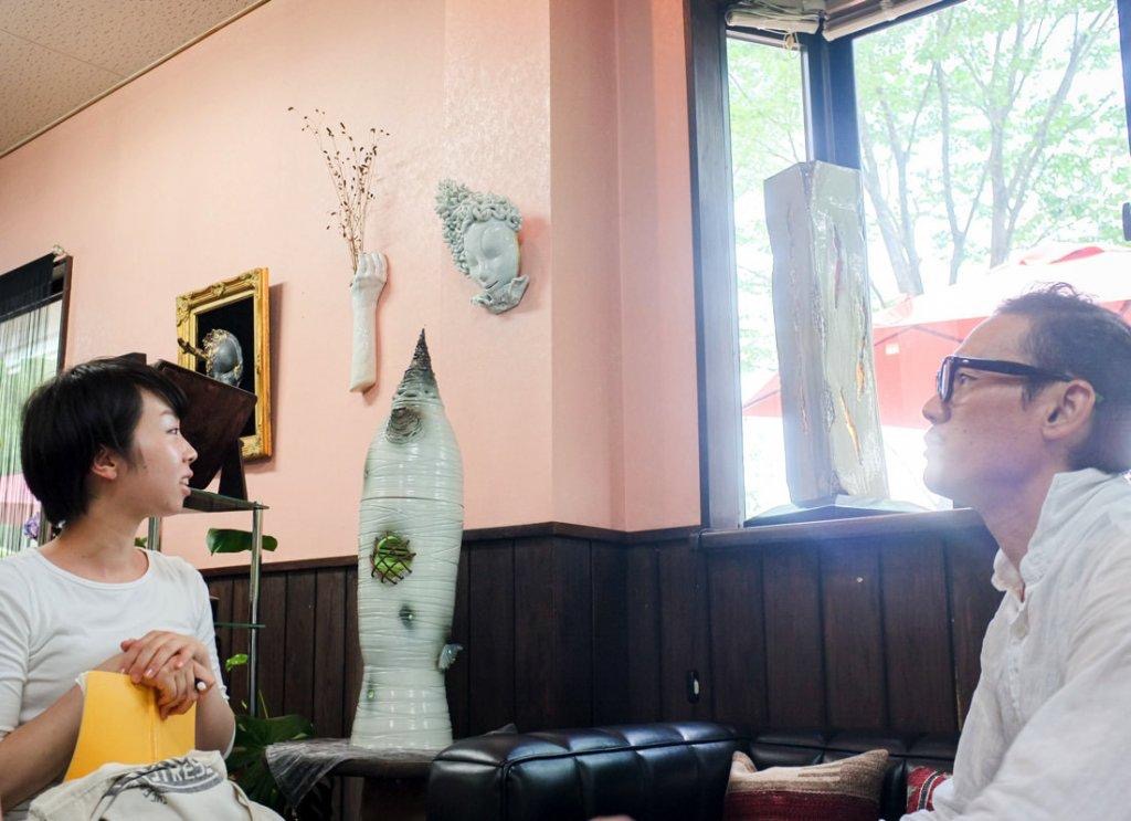 そのお面、気になりますか。『ペルソナ』という作品です。嬉しいとか悲しいとか、感情をお面から読み取ることもできると思うんですけど……。そういう作品名を付けてしまうと、具体的な表情しか見えなくなるじゃないですか? だから、名前は『ペルソナ』。