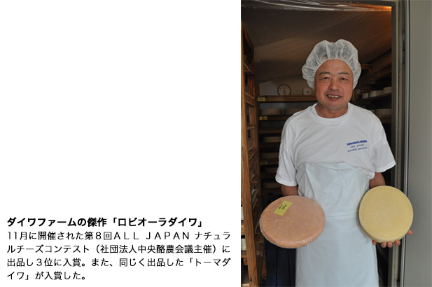 2年に一度開催されるコンテストに6年前から挑戦している大窪さんだが、入賞は一度もない。チーズを作り始めて10年。多くの人に美味しいという評価を受け満を持して出品した。大会には全国から64工房、148点が出場。結果、チーズの本場、北海道勢が上位を占める中で3位。さらに「トーマダイワ」も入賞した。予想外の好成績に「妻が一番喜んだ」と常に支えてくれた妻の律子さんに満面の笑みだ。