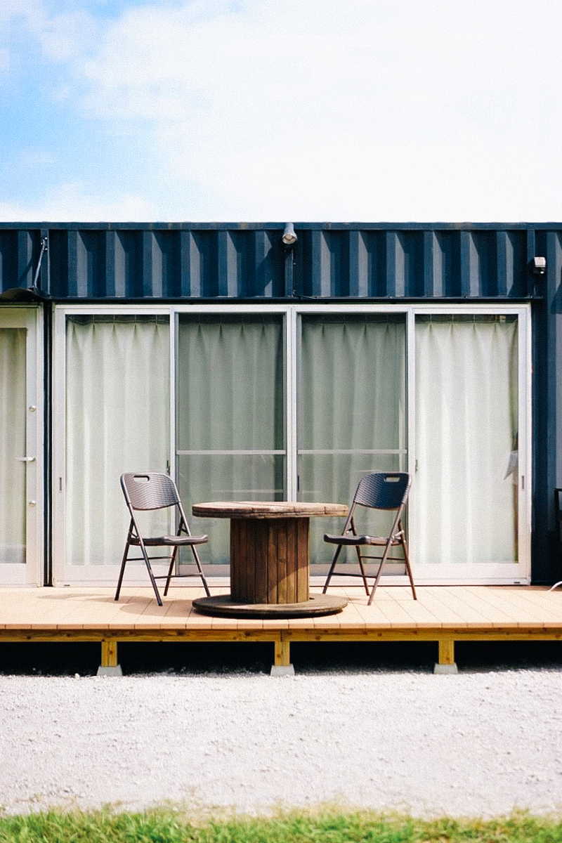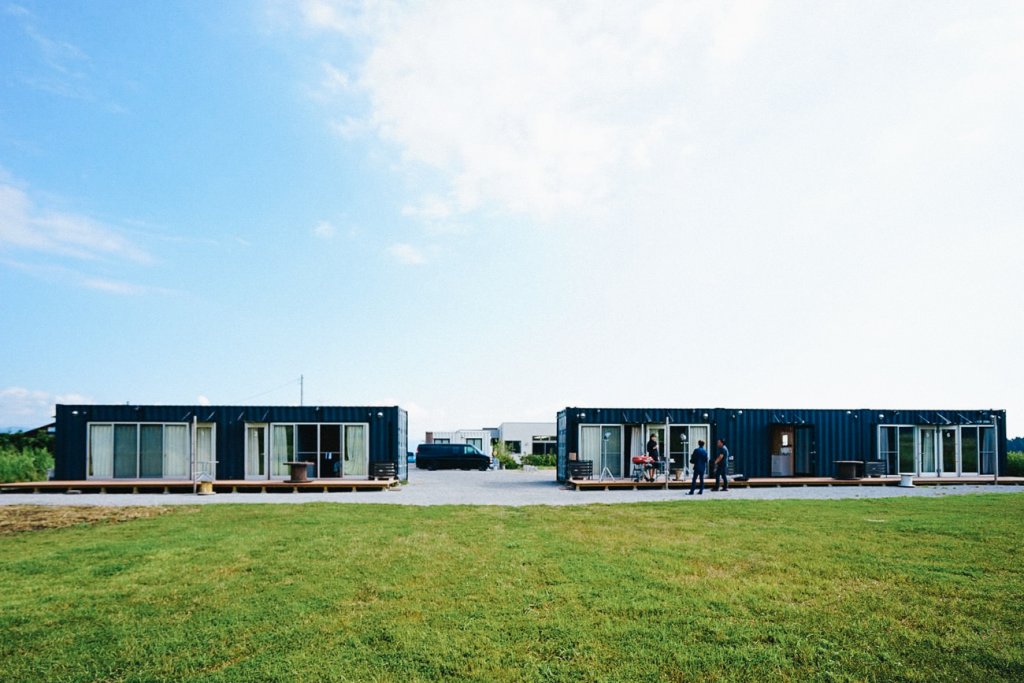 「キレイビレッジ」は、小林インターチェンジから車で3分、北霧島エリアに建てられた、オートキャンプもノマドワークもできるコンテナ建築の宿泊棟。