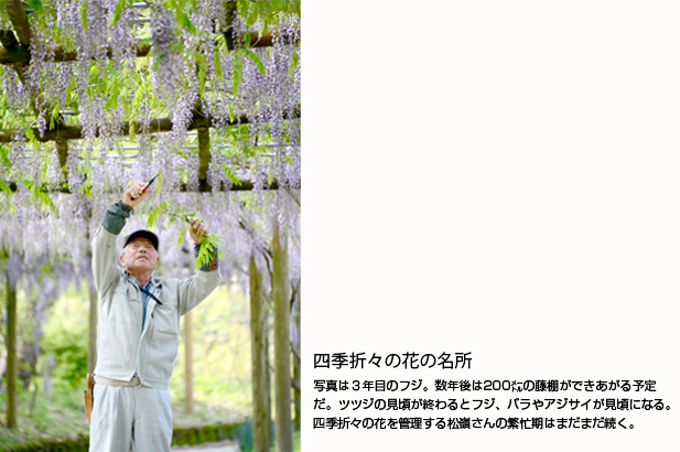 ツツジが見頃を終えるころ、松嶺さんはまだ若いバラや藤棚の手入れに追われていた。数年後、新名物となるであろう花木たちだ。毎年成長し、移り変わる自然美が萩の茶屋にはある。「花咲か爺さん」は、今日も大地に絵を描く。(「広報こばやし」平成27年5月号掲載)